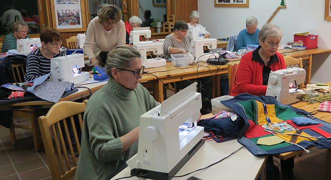 Im Rahmen der Kooperation mit gemeinnützigen Einrichtungen bot die Integrationswerkstatt auch diesmal wieder Raum für soziales Miteinander und sinnstiftende Arbeit. Im Mittelpunkt stand das „Nähstudio“, das an diesem Tag dem guten Zweck diente: Unter fachkundiger Anleitung von der Mitarbeiterin der Integrationswerkstatt, Heidi Jung, fertigten die Landfrauen sog. „Nesteldecken“– spezielle Decken, die durch unterschiedliche Stoffe, Knöpfe, Reißverschlüsse und weitere Materialien dem Bedürfnis demenzkranker Menschen nach taktiler Beschäftigung entgegenkommen.